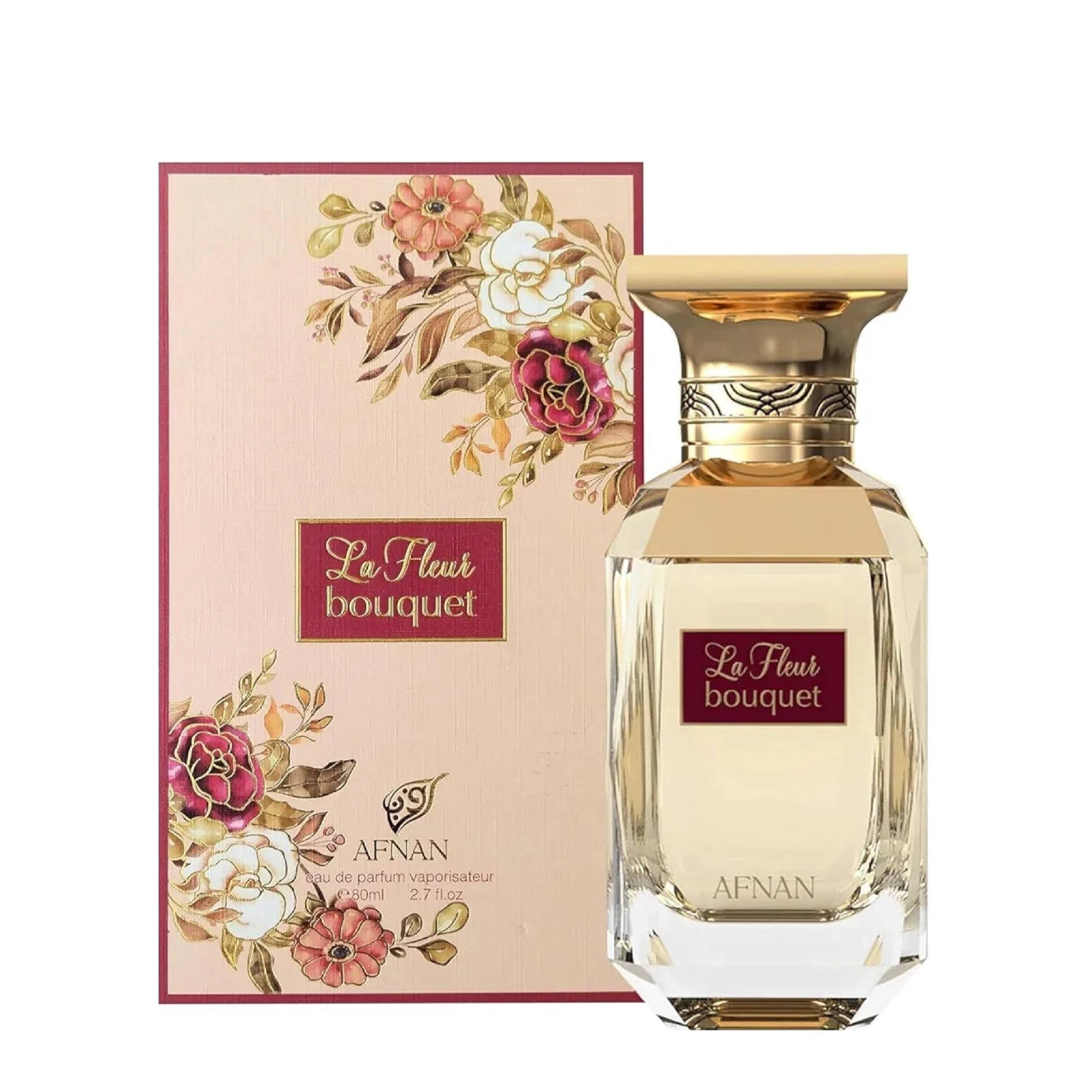 La Fleur Bouquet by Afnan - women perfume - a feminine floral perfume that opens with a precious white bouquet of orange blossom, jasmine and peony. The fruity heart combines lychee and peach with the freshness of bergamot. The delicate base combines musk with moss and petal, creating a refined olfactory signature. Ideal for special occasions and romantic moments.